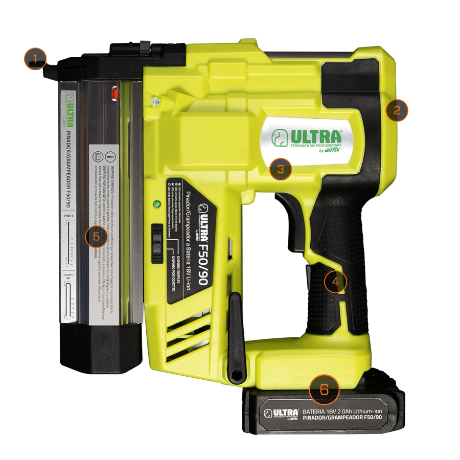 Por funcionar a bateria, o Pinador F5090 oferece total mobilidade, dispensando compressores e mangueiras. Isso permite maior liberdade de movimento, praticidade em diferentes ambientes de trabalho e rapidez na execução das tarefas, mesmo em locais sem acesso à energia elétrica.