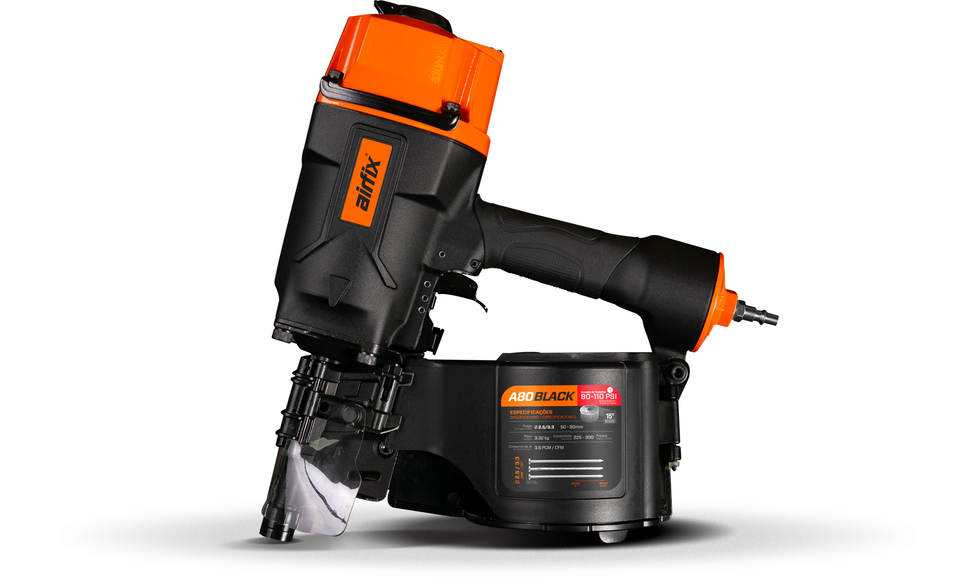 3.84kg de pura performance construída em um corpo leve e altamente resistente elevando produtividade à um nível inédito na aplicação de pregos longos de até 80mm